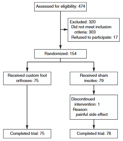Of 474 adults screened for inclusion between December 9, 2003, and January 24, 2005, 154 (32.5%) enrolled in the trial, with 75 randomly allocated to custom foot orthoses and 79 to the control (Fig. 3). The physical characteristics of the participants were similar between groups (Table 2), and there were no differences in foot pain or function scores at baseline (P > .05) (Table 3). Cavus severity ranged from mild (Foot Posture Index score of –2) to severe (Foot Posture Index score of –12), and etiology was classified according to Statler and Tullis8 as congenital (130 patients had idiopathic and 1 had residual clubfoot), neuromuscular (16 had Charcot-Marie-Tooth disease, 4 had poliomyelitis, and 1 had polyneuropathy), or